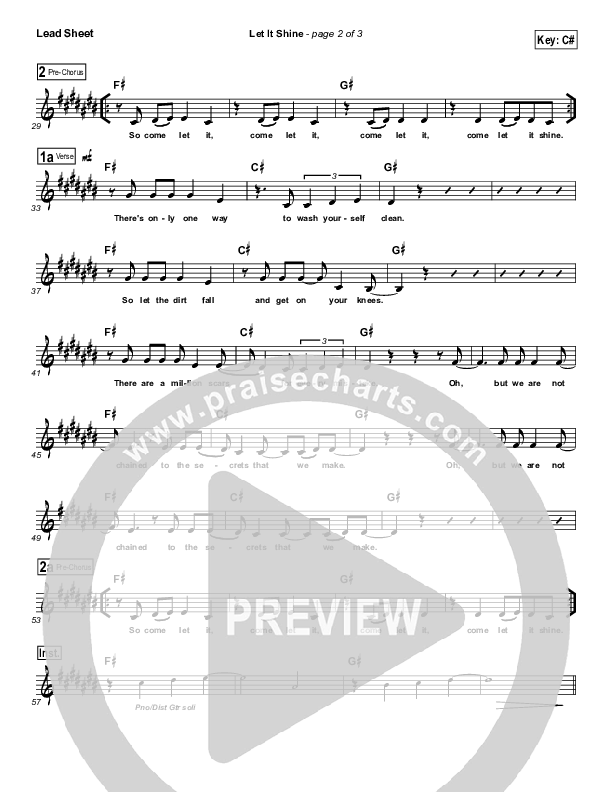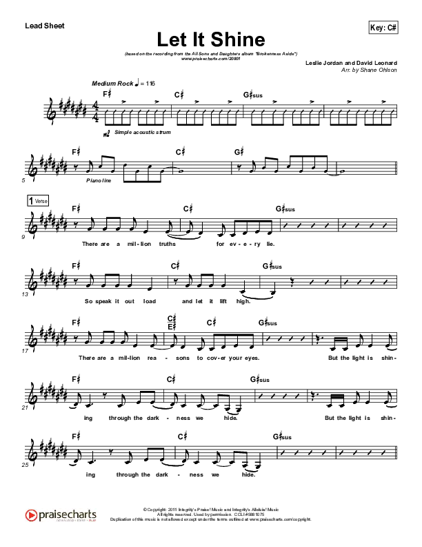 Download the sheet music for Let It Shine by All Sons & Daughters, from the album Brokenness Aside EP . This song was arranged by Shane Ohlson in the key of C#.