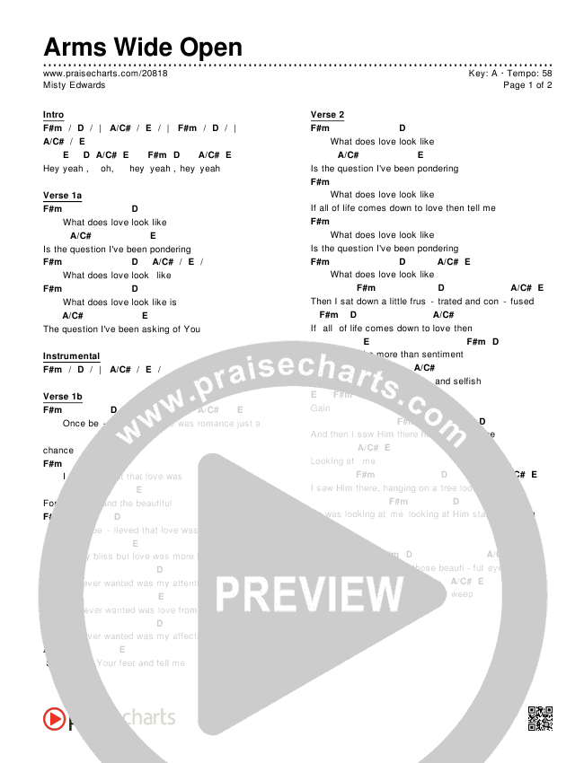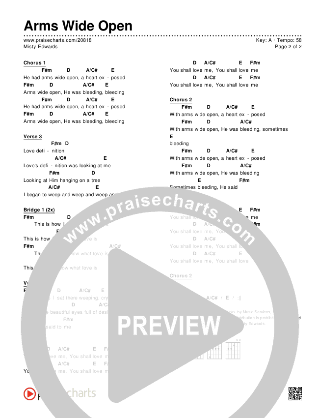 Download the PDF Chord Charts for Arms Wide Open by Misty Edwards, from the album Fling Wide. This song was arranged by Jared Haschek in the key of D, E.