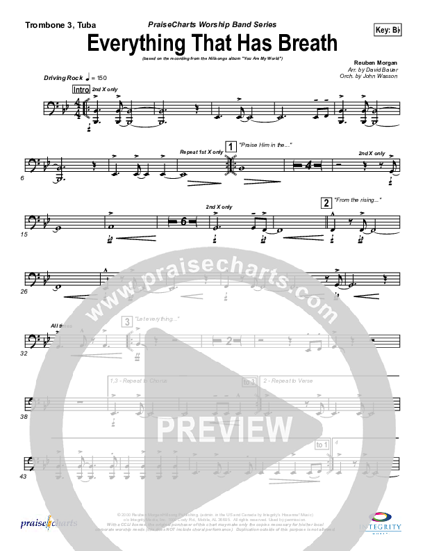Download the Trombone 3/Tuba sheet music for Everything That Has Breath by Hillsong Worship, from the album You Are My World. This song was arranged by David Bauer / John Wasson in the key of Bb, C.