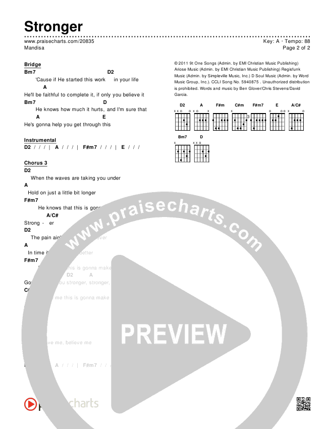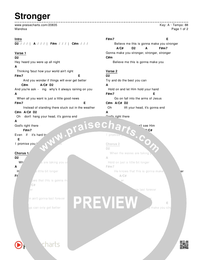 Download the PDF Chord Charts for Stronger by Mandisa, from the album What If We Were Real. This song was arranged by Lee Marcum in the key of A, Ab.