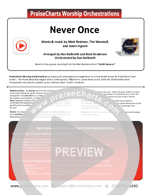 Download the Orchestration for Never Once by Matt Redman, from the album 10000 Reasons. This song was arranged by Daniel Galbraith / Brad Henderson in the key of A, Ab, B, Bb, G.