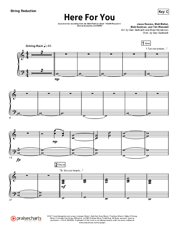 Download the String Reduction sheet music for Here For You by Matt Redman, from the album 10000 Reasons. This song was arranged by Daniel Galbraith in the key of A, Ab, Bb, C, D, G.