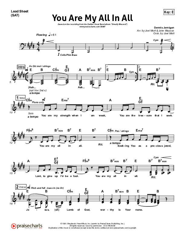 Download the Orchestration for You Are My All In All by Gaither Vocal Band, from the album Greatly Blessed. This song was arranged by Joel Mott / John Wasson in the key of E, F.