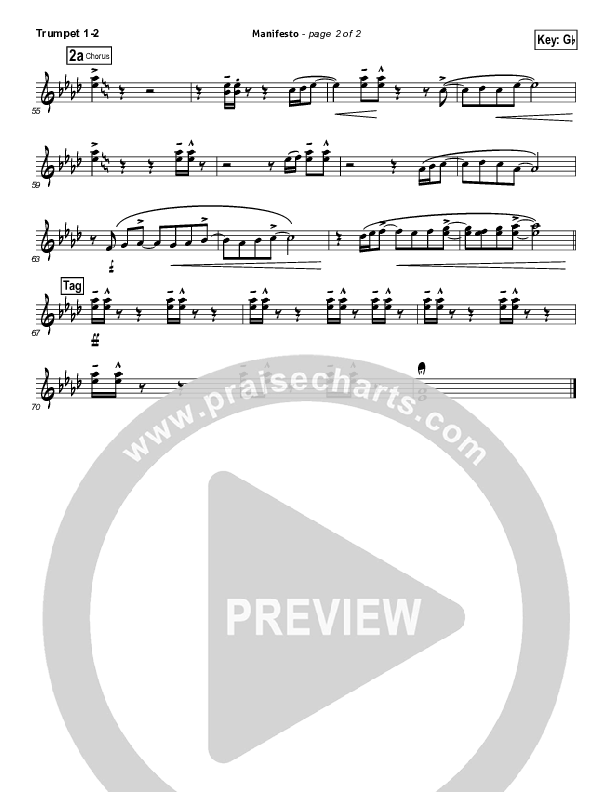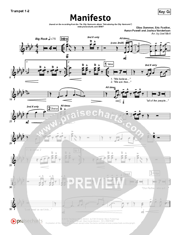 Download the trumpet sheet music for Manifesto by City Harmonic, from the album Introducing The City Harmonic. This song was arranged by Joel Mott in the key of F, Gb.