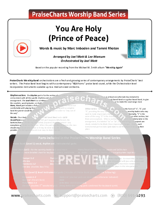 Download the Orchestration for You Are Holy (Prince of Peace) by Michael W. Smith, from the album Worship Again. This song was arranged by Joel Mott / Lee Marcum in the key of F, G.