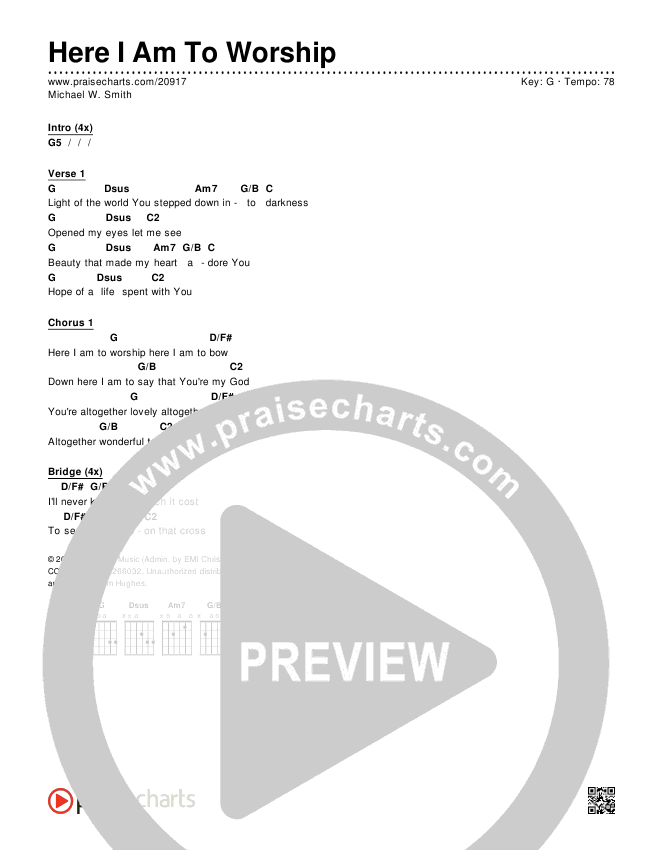 Download the PDF Chord Charts for Here I Am To Worship by Michael W. Smith, from the album Worship Again. This song was arranged by John Wasson in the key of G.