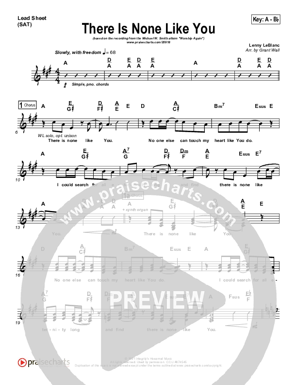 Download the sheet music for There Is None Like You by Michael W. Smith, from the album Worship Again. This song was arranged by Grant Wall in the key of A, G.