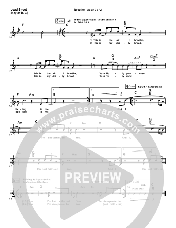 Download the sheet music for Breathe by Michael W. Smith, from the album Worship. This song was arranged by John Wasson / Daniel Galbraith in the key of A, Bb.