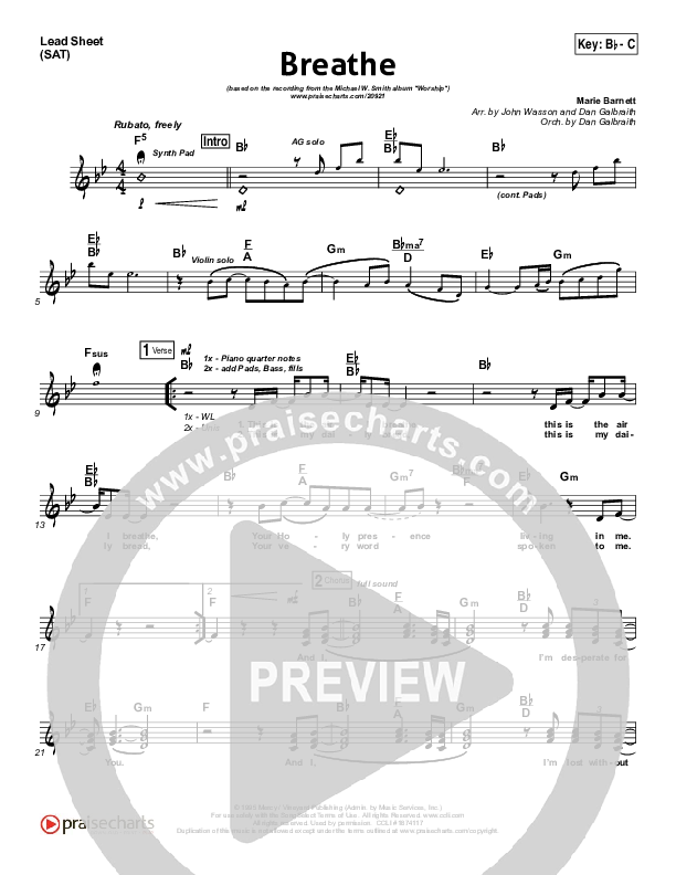 Download the sheet music for Breathe by Michael W. Smith, from the album Worship. This song was arranged by John Wasson / Daniel Galbraith in the key of A, Bb.