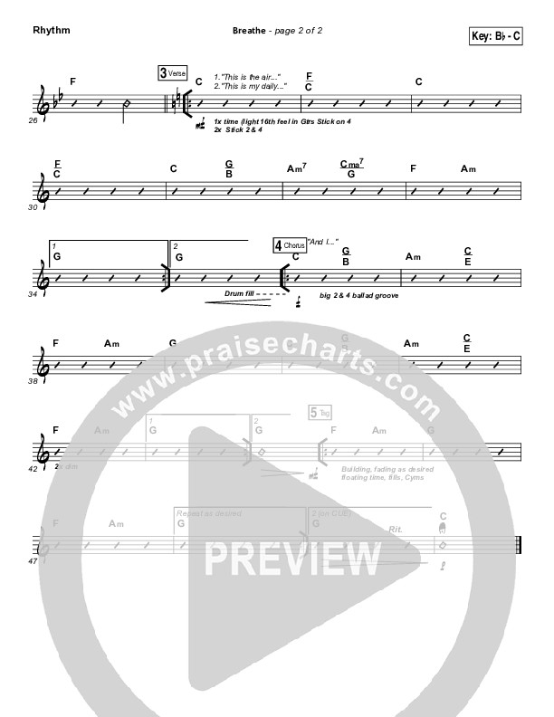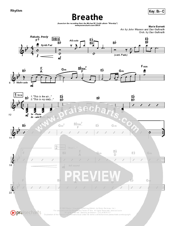 Download the Rhythm Chart for Breathe by Michael W. Smith, from the album Worship. This song was arranged by John Wasson / Daniel Galbraith in the key of A, Bb.