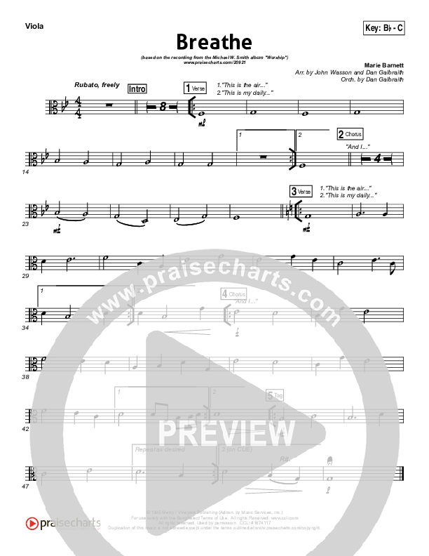 Download the Viola sheet music for Breathe by Michael W. Smith, from the album Worship. This song was arranged by John Wasson / Daniel Galbraith in the key of A, Bb.
