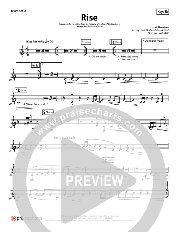 Download the Trumpet 3 sheet music for Rise by Hillsong Worship, from the album God Is Able. This song was arranged by Joel Mott / Grant Wall in the key of Bb, C.