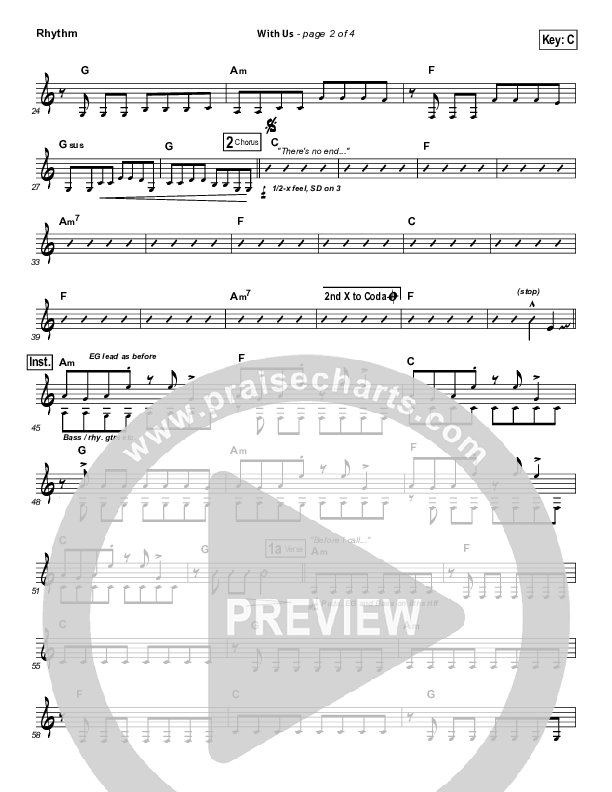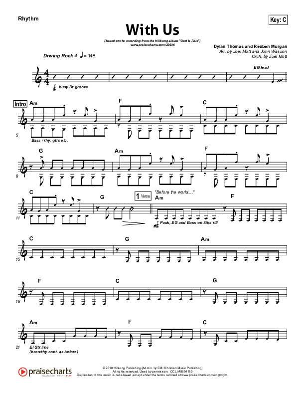 Download the Rhythm Chart for With Us by Hillsong Worship, from the album God Is Able. This song was arranged by Joel Mott / John Wasson in the key of C, D.