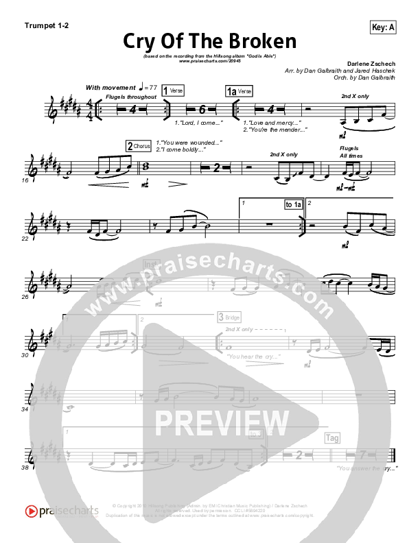 Download the trumpet sheet music for Cry Of The Broken by Hillsong Worship, from the album God Is Able. This song was arranged by Daniel Galbraith / Jared Haschek in the key of A, Bb.