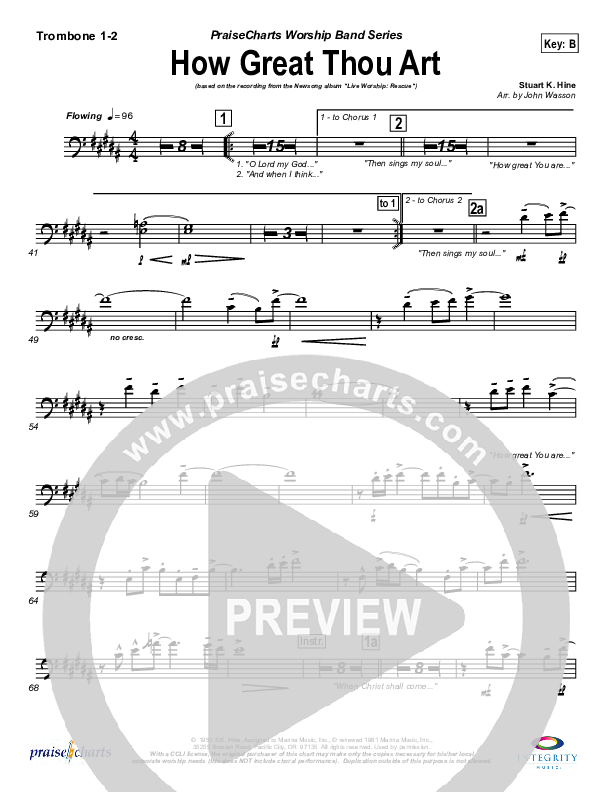 Download the Trombone 1,2 sheet music for How Great Thou Art by Newsong, from the album Rescue. This song was arranged by John Wasson in the key of B, Bb.