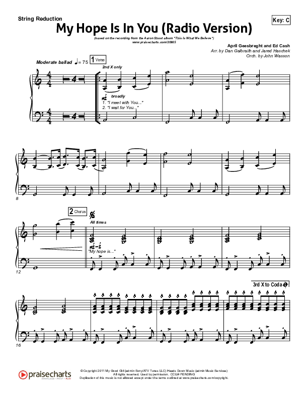 Download the Orchestration for My Hope Is In You (Radio) by Aaron Shust, from the album My Hope Is In You - Single. This song was arranged by Daniel Galbraith / John Wasson / Jared Haschek in the key of C, D.