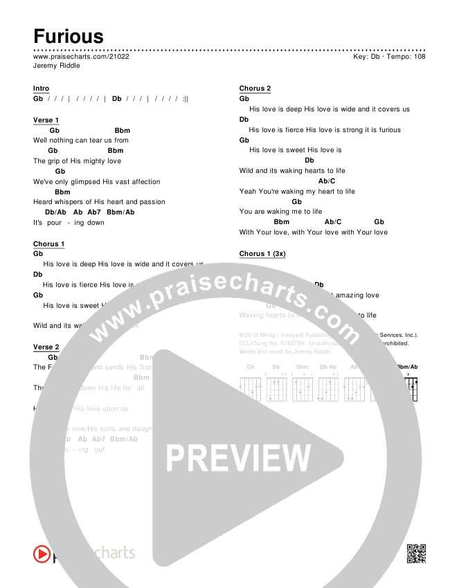 Download the PDF Chord Charts for Furious by Jeremy Riddle, from the album Furious. This song was arranged by Lee Marcum in the key of C, Db.