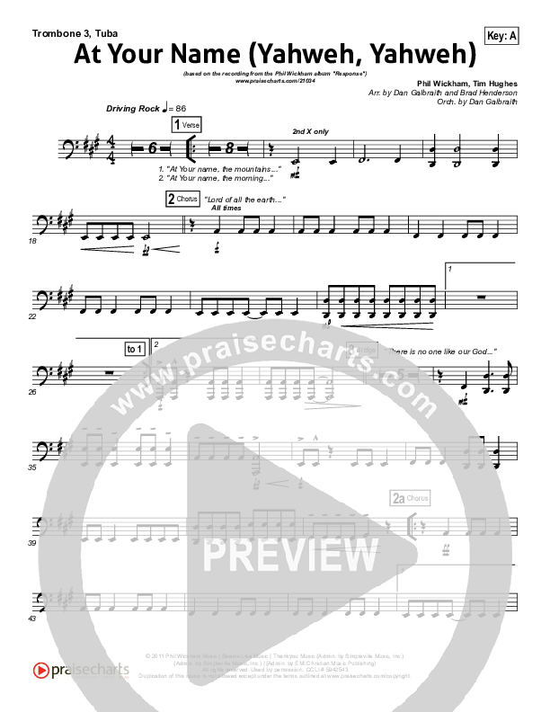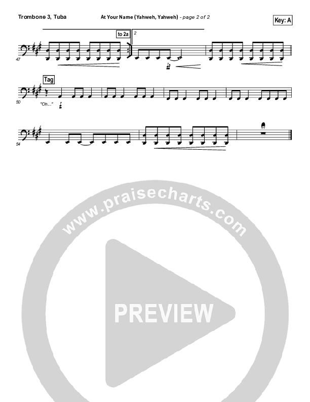 Download the Trombone 3/Tuba sheet music for At Your Name by Phil Wickham, from the album Response. This song was arranged by Daniel Galbraith / Brad Henderson in the key of A, G.