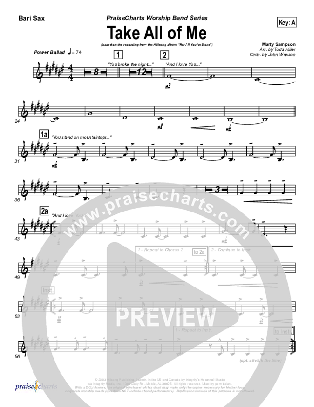 Download the Bari Sax sheet music for Take All Of Me by Hillsong Worship, from the album For All You've Done. This song was arranged by Todd Hiller / John Wasson in the key of A, Ab, G.