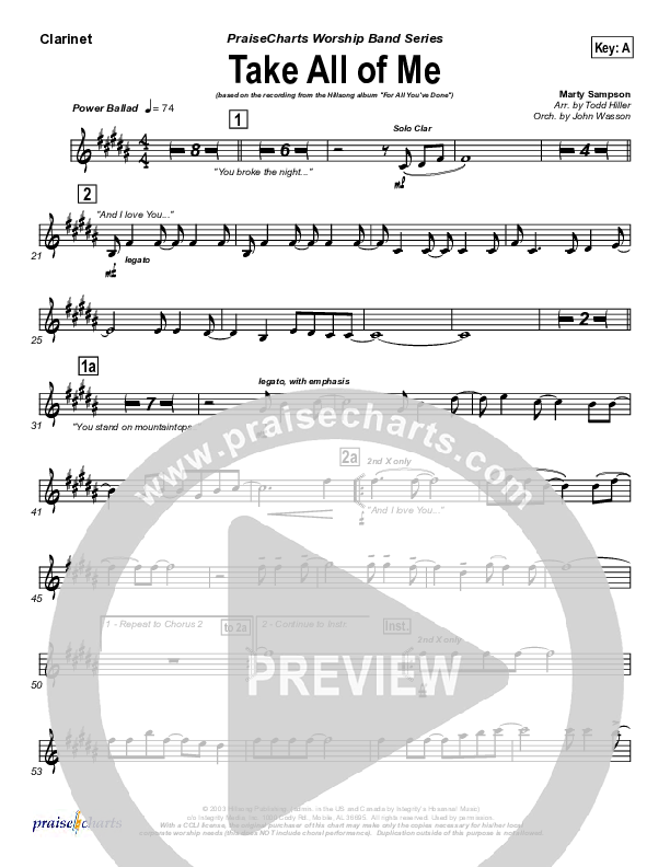 Download the Orchestration for Take All Of Me by Hillsong Worship, from the album For All You've Done. This song was arranged by Todd Hiller / John Wasson in the key of A, Ab, G.
