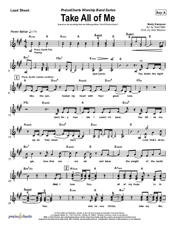 Download the sheet music for Take All Of Me by Hillsong Worship, from the album For All You've Done. This song was arranged by Todd Hiller / John Wasson in the key of A, Ab, G.