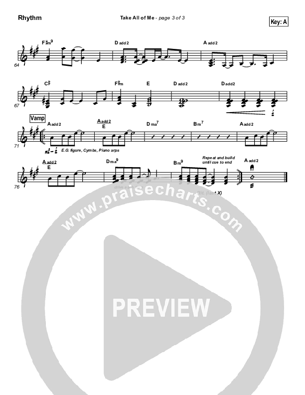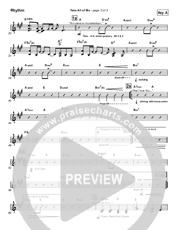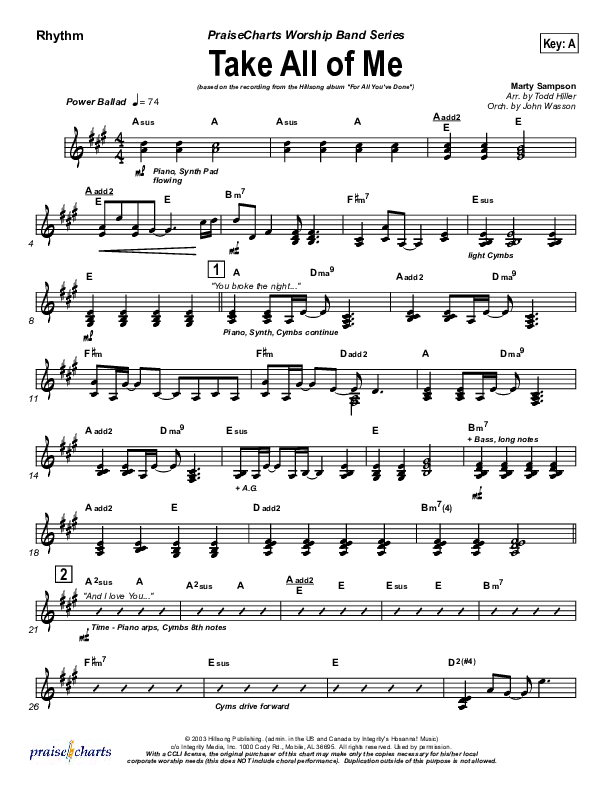 Download the Rhythm Chart for Take All Of Me by Hillsong Worship, from the album For All You've Done. This song was arranged by Todd Hiller / John Wasson in the key of A, Ab, G.