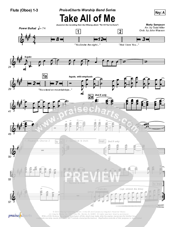 Download the Orchestration wind parts for Take All Of Me by Hillsong Worship, from the album For All You've Done. This song was arranged by Todd Hiller / John Wasson in the key of A, Ab, G.