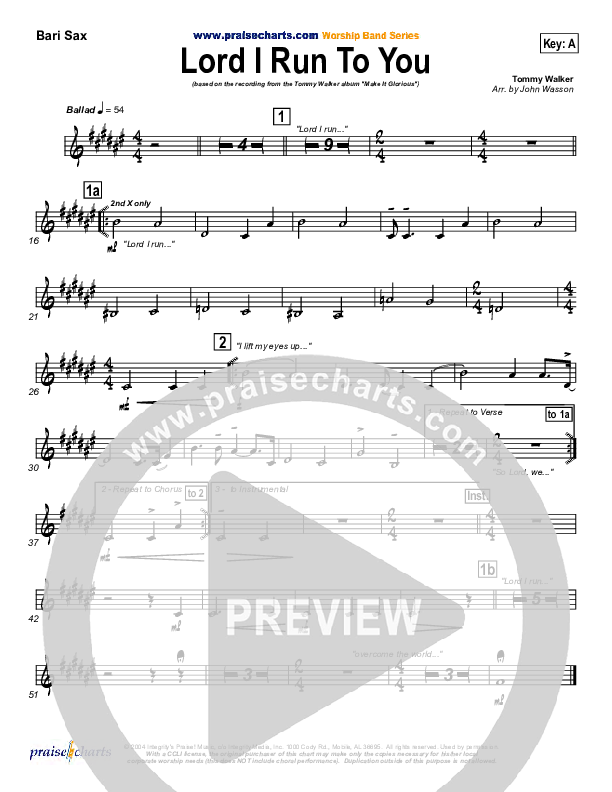 Download the Bari Sax sheet music for Lord I Run To You by Tommy Walker, from the album Make It Glorious. This song was arranged by John Wasson in the key of A, G.