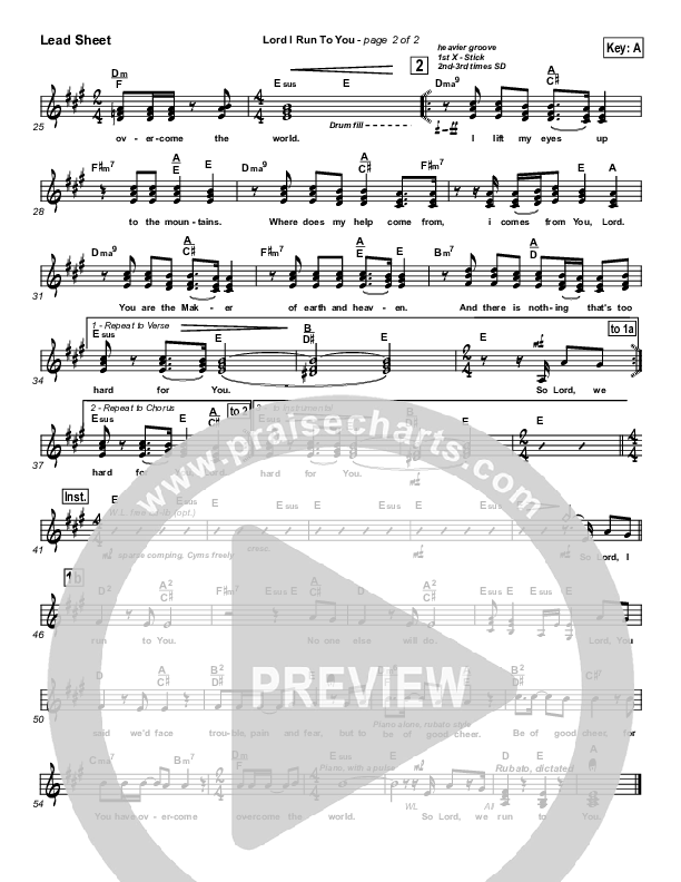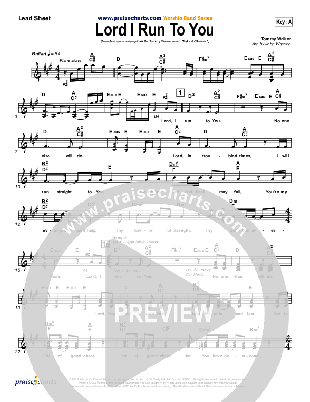Download the sheet music for Lord I Run To You by Tommy Walker, from the album Make It Glorious. This song was arranged by John Wasson in the key of A, G.