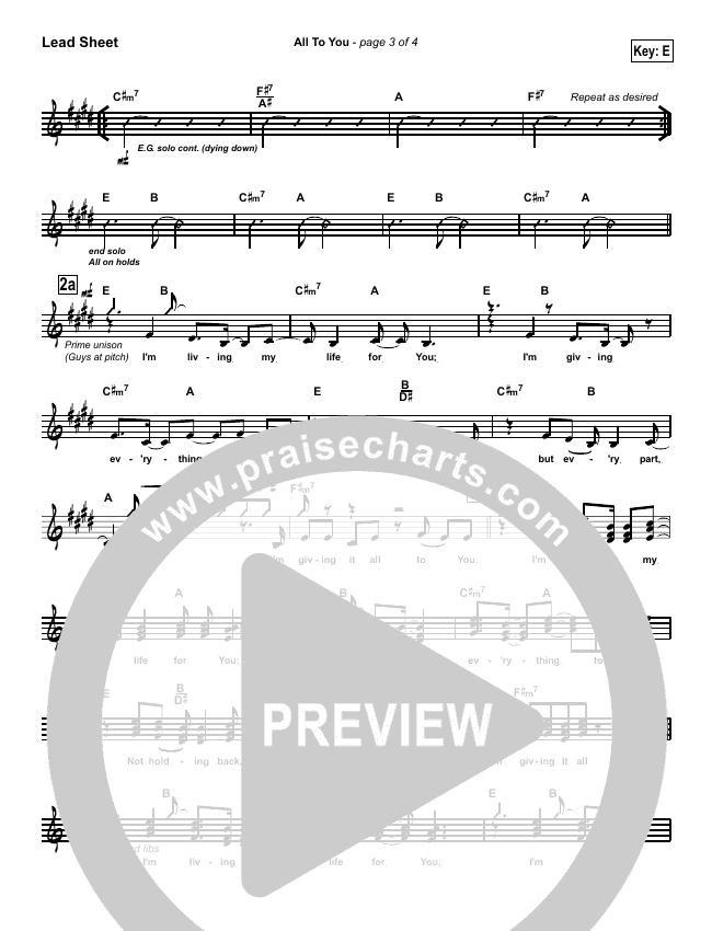 Download the sheet music for All To You by Lincoln Brewster, from the album All To You. This song was arranged by Daniel Galbraith in the key of C, E.