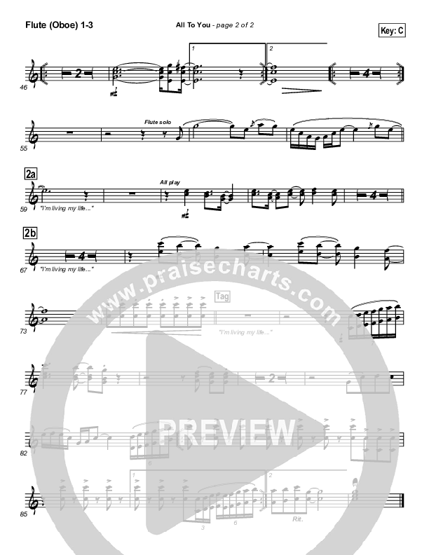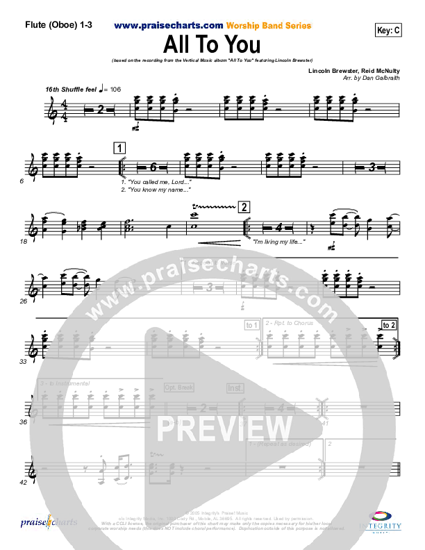 Download the Flute/Oboe sheet music for All To You by Lincoln Brewster, from the album All To You. This song was arranged by Daniel Galbraith in the key of C, E.