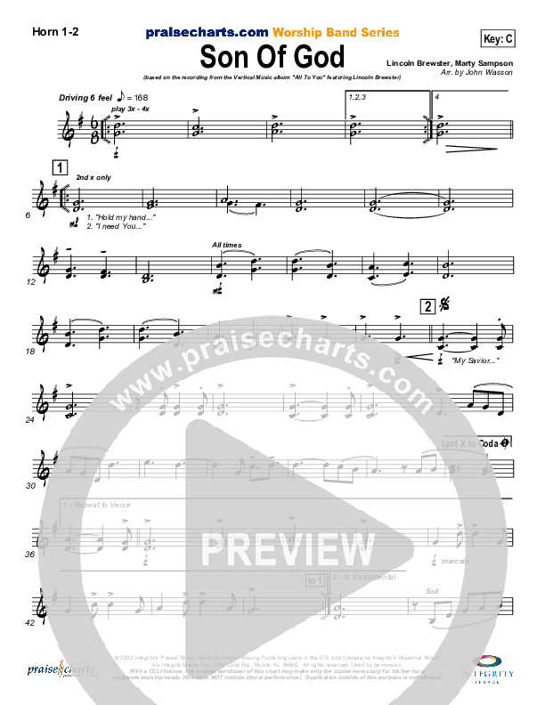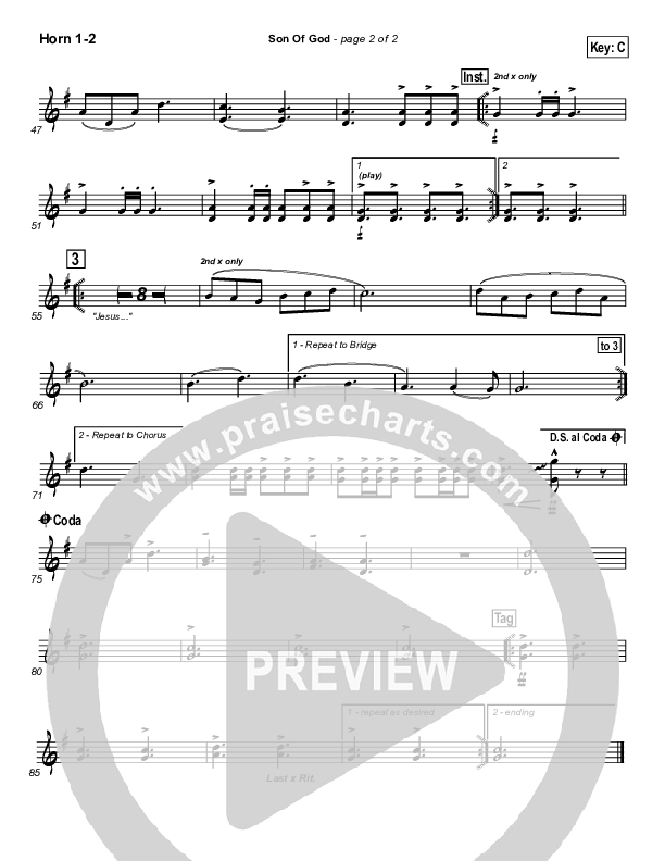 Download the French Horn sheet music for Son Of God by Hillsong Worship, from the album All To You. This song was arranged by John Wasson in the key of D.