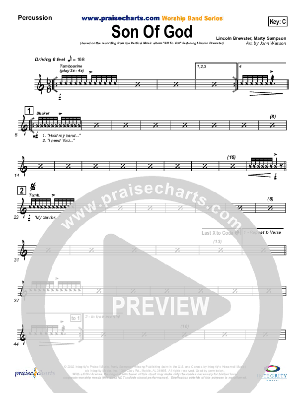 Download the percussion sheet music for Son Of God by Hillsong Worship, from the album All To You. This song was arranged by John Wasson in the key of D.