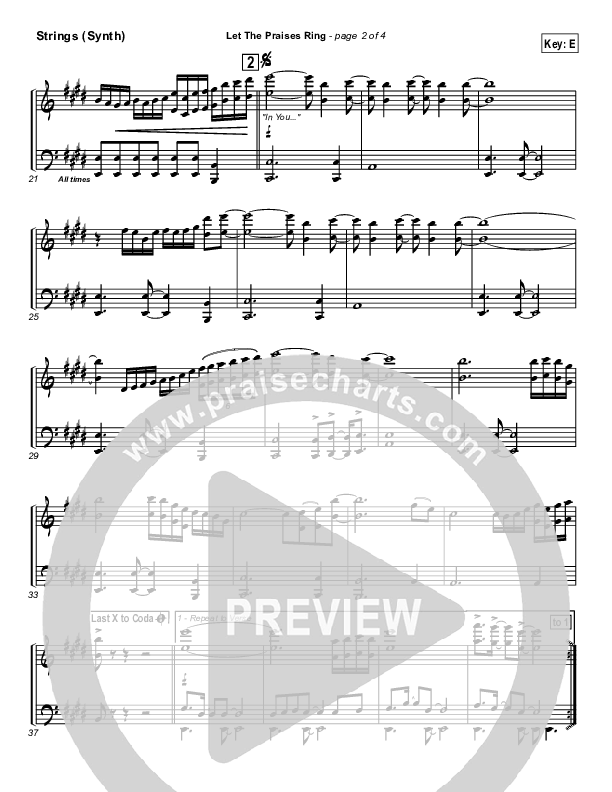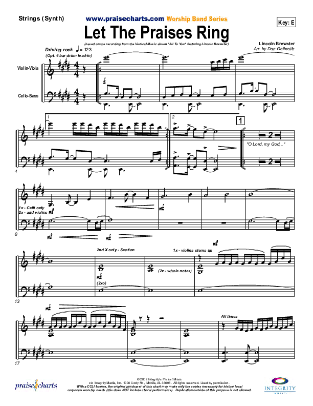 Download the Orchestration for Let The Praises Ring by Lincoln Brewster, from the album All To You. This song was arranged by Daniel Galbraith in the key of D, E.