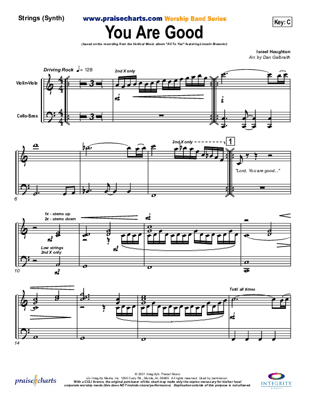 Download the Orchestration for You Are Good by Lincoln Brewster, from the album All To You. This song was arranged by Daniel Galbraith in the key of Bb, C.