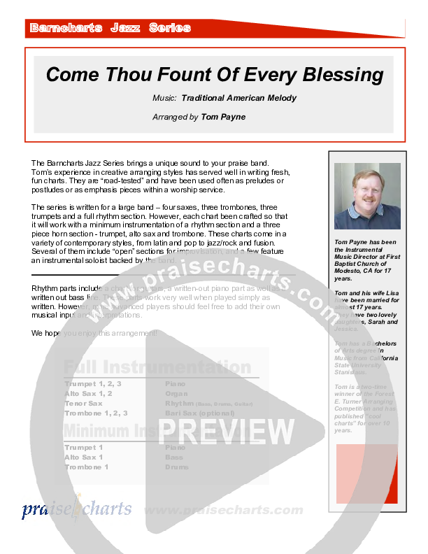 Download the Orchestration for Come Thou Fount Of Every Blessing (Instrumental) by Tom Payne, from the album Tom Payne Barncharts Jazz Series. This song was arranged by Tom Payne in the key of Eb.