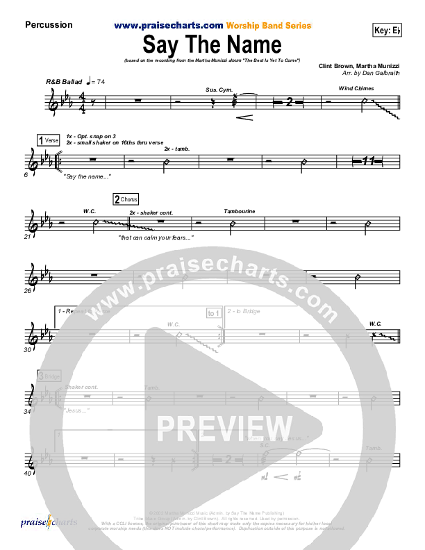 Download the percussion sheet music for Say The Name by Martha Munizzi, from the album The Best Is Yet To Come. This song was arranged by Daniel Galbraith in the key of Eb, F.