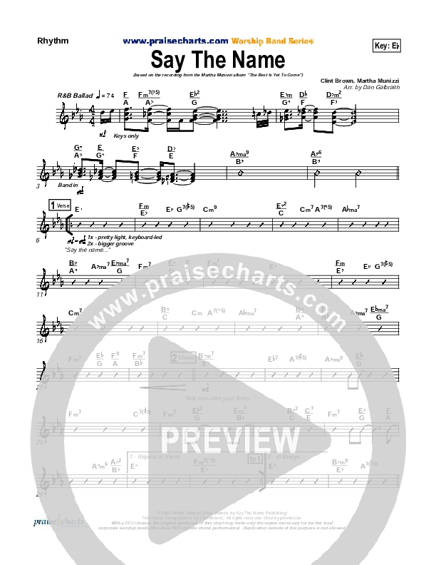 Download the Rhythm Chart for Say The Name by Martha Munizzi, from the album The Best Is Yet To Come. This song was arranged by Daniel Galbraith in the key of Eb, F.