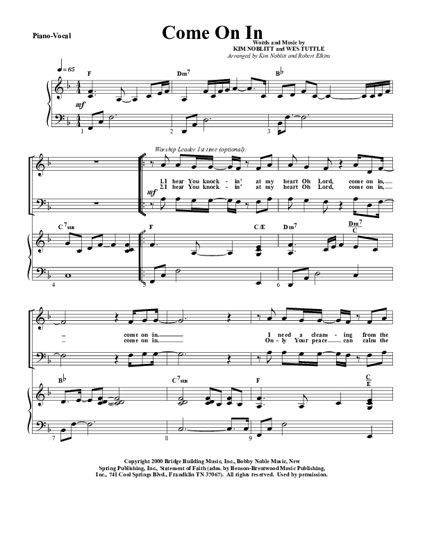 Download the sheet music for Come On In by G3 Worship, from the album Hallelujah Jesus.