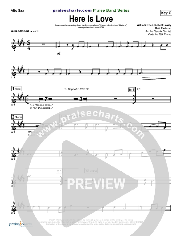 Download the AltoSax sheet music for Here Is Love by Matt Redman / Passion, from the album Passion: Hymns Ancient and Modern. This song was arranged by Erik Foster / Charlie Sinclair in the key of F, G.