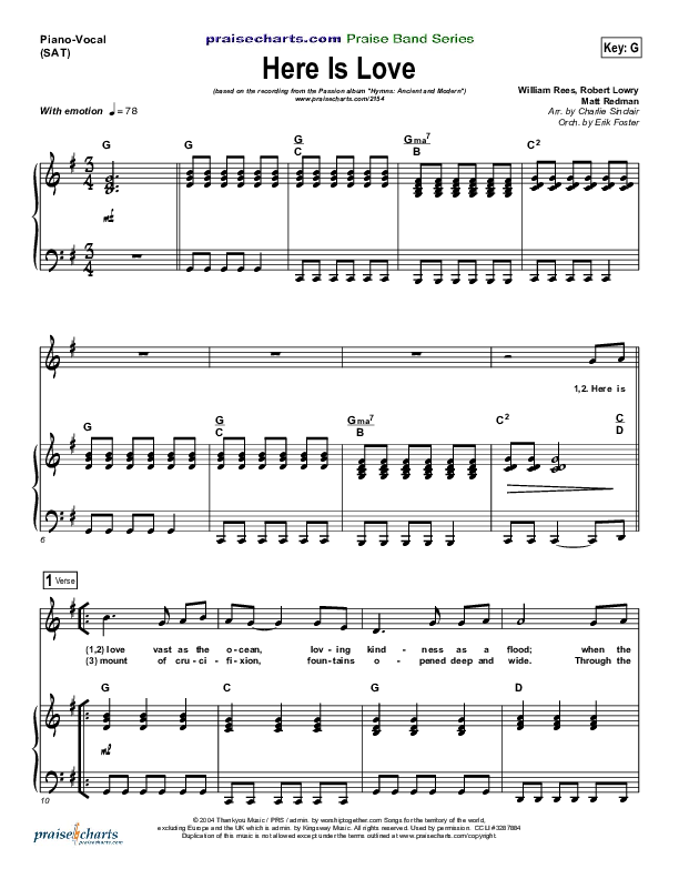 Download the sheet music for Here Is Love by Matt Redman / Passion, from the album Passion: Hymns Ancient and Modern. This song was arranged by Erik Foster / Charlie Sinclair in the key of F, G.