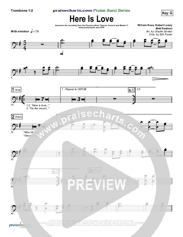 Download the Trombone 1,2 sheet music for Here Is Love by Matt Redman / Passion, from the album Passion: Hymns Ancient and Modern. This song was arranged by Erik Foster / Charlie Sinclair in the key of F, G.