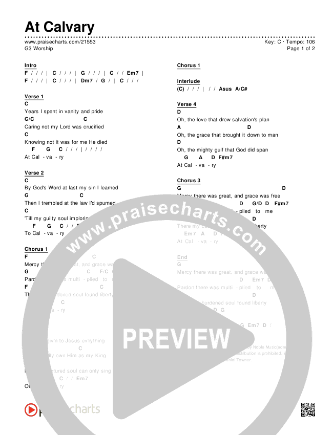Download the PDF Chord Charts for At Calvary by G3 Worship, from the album Draw Me Nearer Once Again. This song was arranged by Kim Noblitt / Robert Elkins in the key of C.