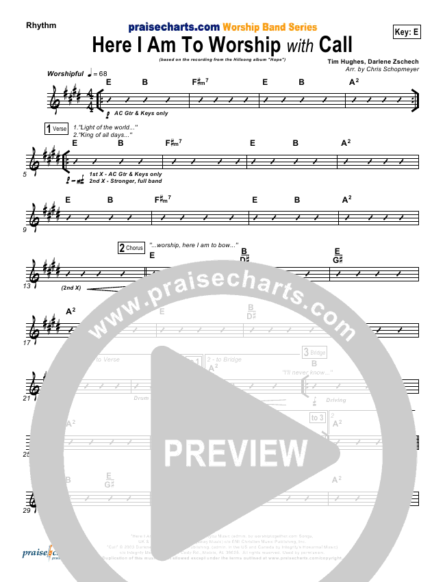Download the Rhythm Chart for Here I Am To Worship (with Call) by Hillsong Worship, from the album Hope. This song was arranged by Chris Schopmeyer in the key of E, F.