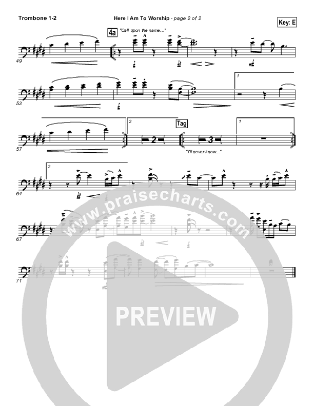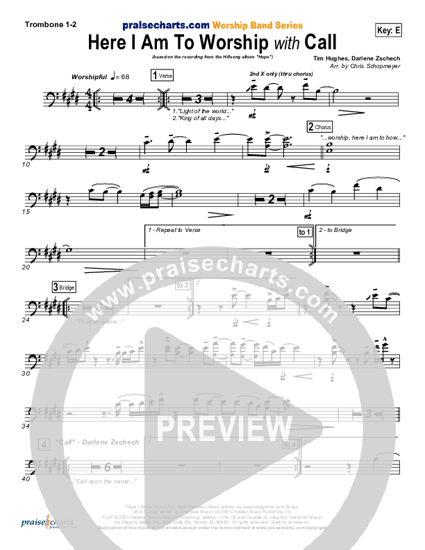Download the Trombone 1,2 sheet music for Here I Am To Worship (with Call) by Hillsong Worship, from the album Hope. This song was arranged by Chris Schopmeyer in the key of E, F.