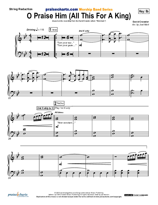 Download the Orchestration for O Praise Him by David Crowder, from the album Here I Am To Worship (Vol. 1). This song was arranged by Joel Mott in the key of A, Bb.