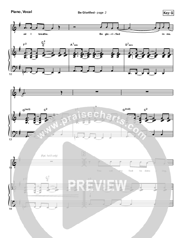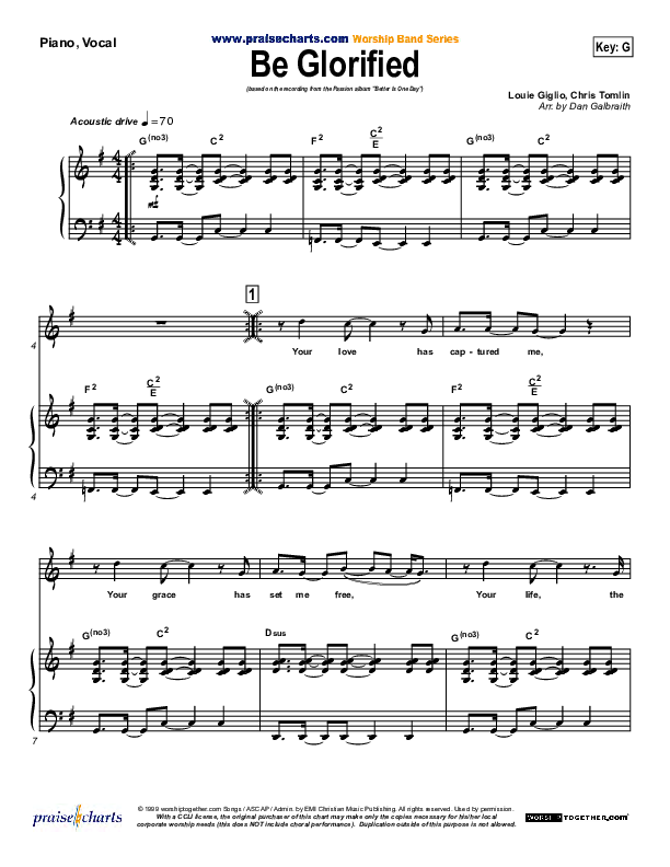 Download the sheet music for Be Glorified by Chris Tomlin, from the album Here I Am To Worship (Vol. 1). This song was arranged by Daniel Galbraith in the key of F, G.