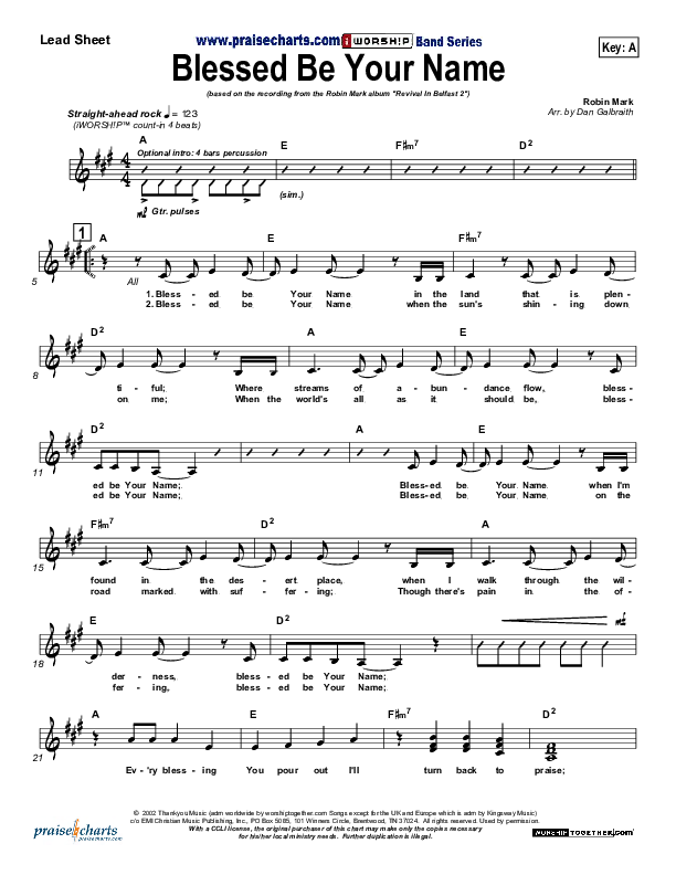 Download the Orchestration for Blessed Be Your Name by Robin Mark, from the album Revival In Belfast 2. This song was arranged by Daniel Galbraith in the key of A, Bb, C.