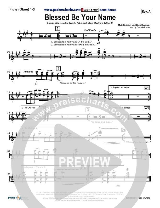 Download the Orchestration wind parts for Blessed Be Your Name by Robin Mark, from the album Revival In Belfast 2. This song was arranged by Daniel Galbraith in the key of A, Bb, C.