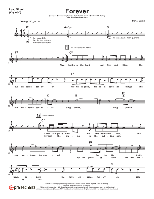 Download the sheet music for Forever by Chris Tomlin, from the album The Noise We Make. This song was arranged by Daniel Galbraith in the key of A, G.